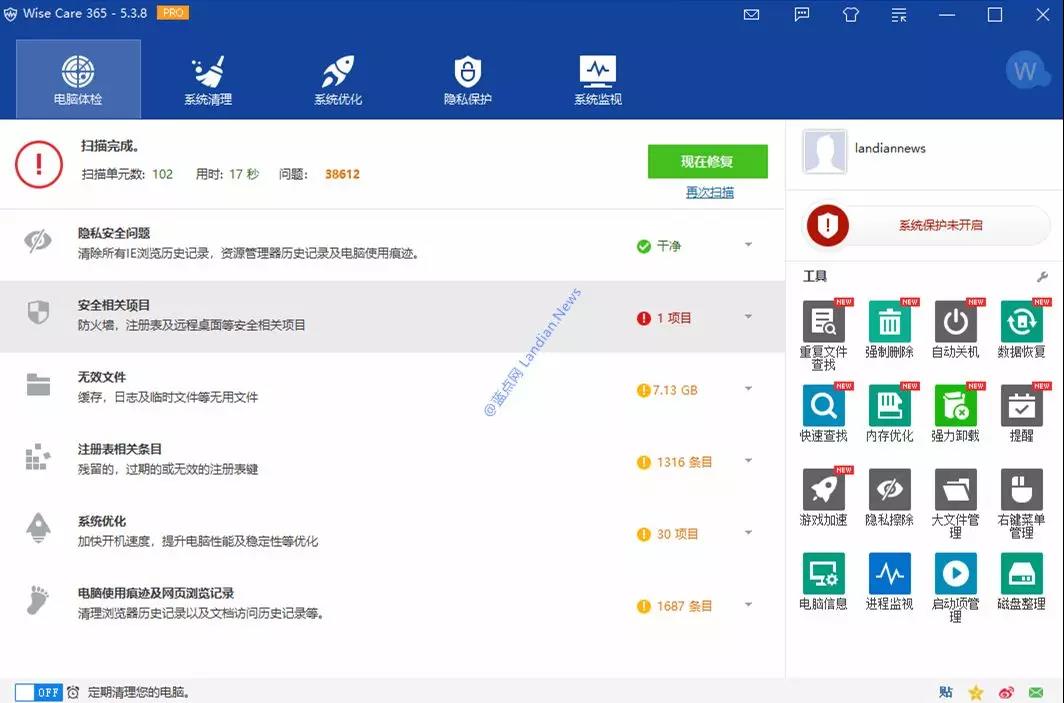 如果你使用Windows 10的话原则上蓝点网不建议你进行各种系统优化,因为有时候可能会让系统无端出现崩溃。智慧清理专业版默认情况下同样会提供很多系统优化建议,我们还是建议大家在设置中关闭这些选项以免出问题。当然如果你觉得这些优化有必要的话可以提前创建系统还原点,如果出现问题则通过系统还原功能还原正常状态。毕竟优化只需要操作一次所以没问题的话那就继续使用吧,有关系统还原点方面的操作教程请查看蓝点网的文章。